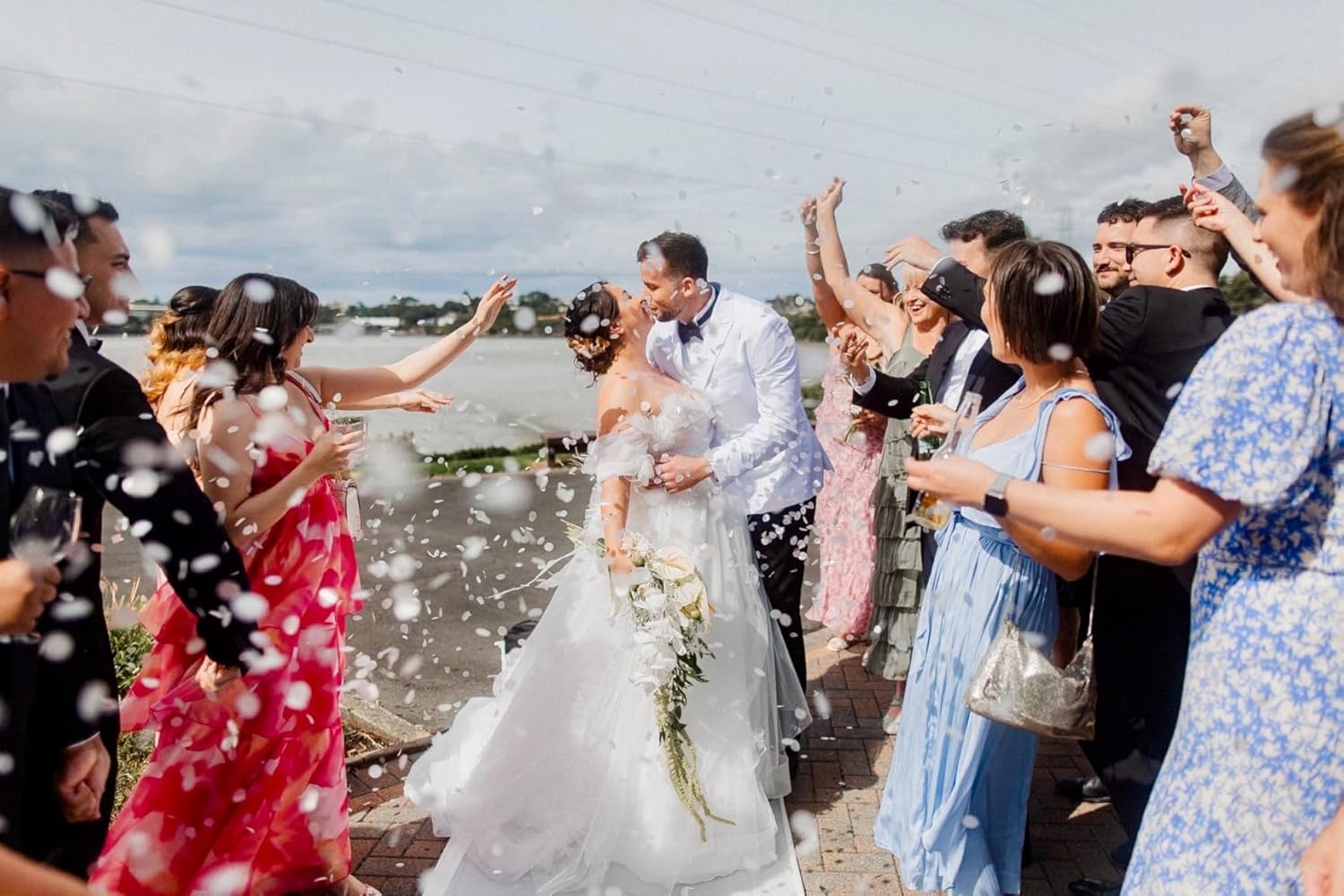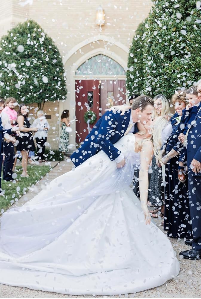 The confetti came in a small silver bag. That worried me because i thought there wouldn’t be enough for all my guests to throw. The best man gave out the confetti right before our grand entrance and it was perfect for all 64 of my guests. Really happy about that. The photos that came out of my confetti toss were stunning! i actually like it better than using a confetti popper because then guests in pictures don’t have an object in their hand. This rice paper confetti also was way to fly with, as poppers are not permitted in luggage. It was biodegradable which made my venue happy. The color looked great in photos. Functional for traveling and looks super cute/fun! I almost didn’t do the confetti because of the headache with travel restrictions but man, what a shot! def worth it! I got married in New Zealand and customs was fine with it. I declared it.